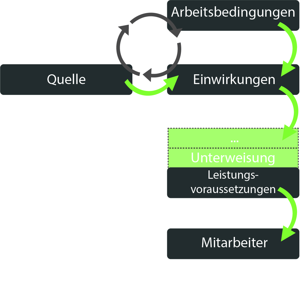 Ein wichtiger Grundsatz dabei ist, dass die Gefährdung erst dann wirksam wird, wenn die schädigenden Einwirkungen auf den Menschen treffen. Das bedeutet, dass auch in diesem Modell der Mensch eine entscheidende Rolle spielt. Denn bei der Analyse werden auch die individuellen Leistungsvoraussetzungen des Mitarbeiters berücksichtigt und in die Entwicklung der Maßnahmen einbezogen. Diese Leistungsvoraussetzungen sind maßgeblich dafür verantwortlich, wie die schädigenden Auswirkungen sich bei dem Mitarbeiter manifestieren. Sie können ihm zum Beispiel helfen, eine mögliche Einwirkung abzuwehren bzw. „wegzustecken“.