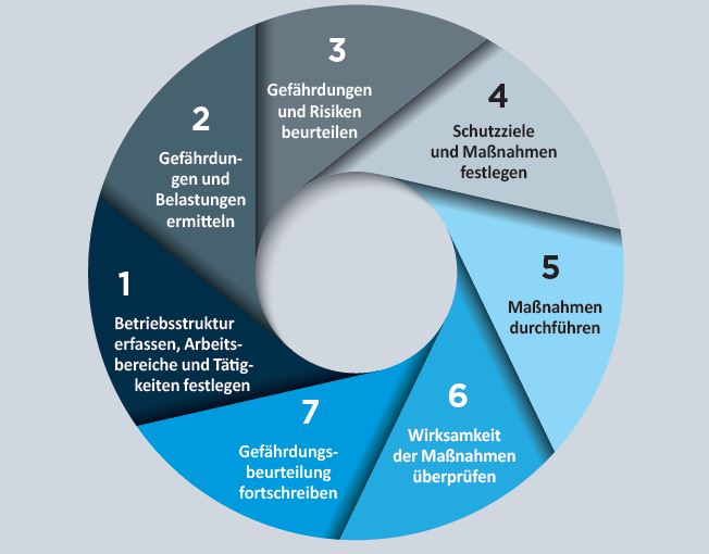 Das Arbeitsschutzgesetz verpflichtet den Unternehmer, die Gefährdungen für seine Mitarbeiter zu beurteilen und entsprechende Gegenmaßnahmen zu treffen. Leider gibt das Gesetz nicht vor, wie genau dies erfolgen soll. Der zuvor gezeigte 7-Schritte Prozess hat sich in der Praxis bewährt, aber natürlich sind Gefährdungen immer spezifisch für den Betrieb oder sogar einzelnen Mitarbeiter zu betrachten. Je nach Situation greifen dann noch ergänze Vorschriften wie zum Beispiel die Gefahrstoff- oder Biostoffverordnung hinzugezogen werden.