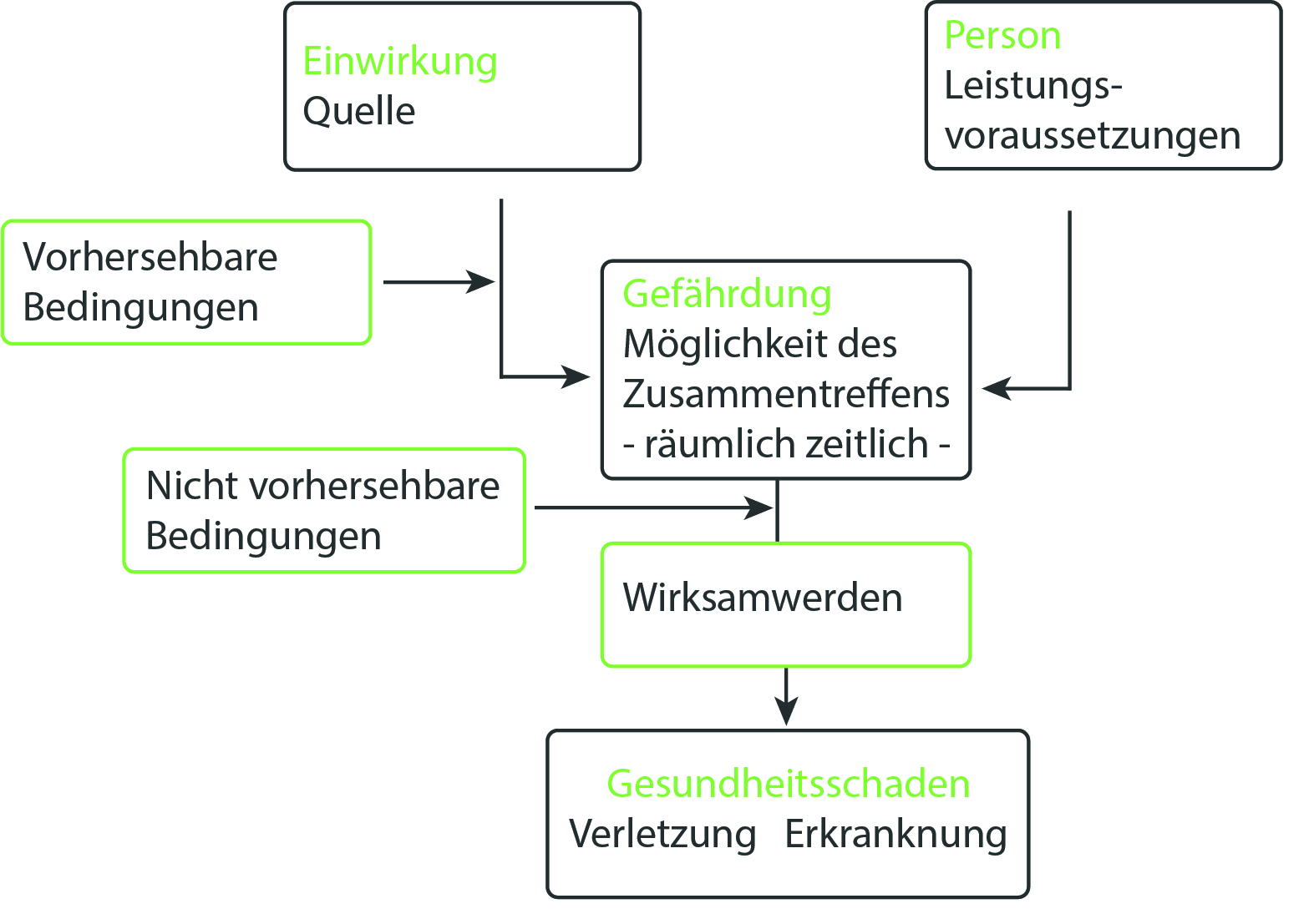 Die Erstellung einer Gefährdungsbeurteilung basiert immer auf einem Zusammenspiel beider Arten der Analyse, also mit der Feststellung der vorhersehbaren und nicht vorhersehbaren Bedingungen. Im Anschluss geht es dann darum diesen Bedingungen im besten Fall zu eliminieren bzw. zu reduzieren.