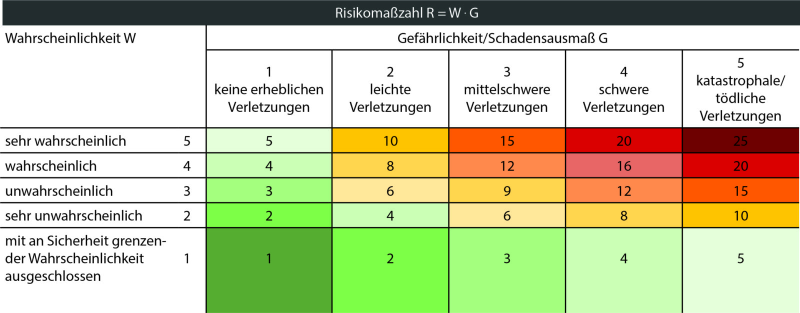 Für die Bergwertung des Risikos in der Ausgangssituation wird eine Risikomatrix zu Hilfe genommen. Die Qualität des Risikos (R) ist dabei das Produkt aus der Wahrscheinlichkeit (W), dass ein Schaden eintritt, und der möglichen Schadensschwere (G) bezeichnet. Da gibt es viele mögliche Varianten der Matrix, die ihr natürlich frei wählen könnt. Ich stelle dir hier mal die Version vor, mit der ich beim Beurteilen von Stunts in der Regel arbeiten. Ich finde jedenfalls, die ist sehr einfach zu nutzen.